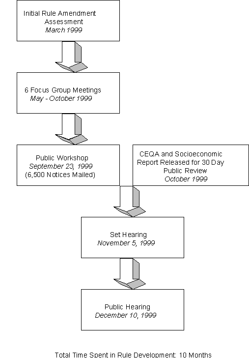 During the rulemaking process for PAR 1121, the AQMD staff worked with a Focus Group to discuss proposed amendments. The Focus Group included water heater manufacturers, water heater manufacturing associations, developers of low-NOx burners, gas utility representatives, and the California Energy Commission. The Focus Group met six times during the course of the rule development process. In addition, staff visited two burner manufacturers in Northern California and two of the five water heater manufacturers in Tennessee and South Carolina. A public workshop was held on September 23, 1999.