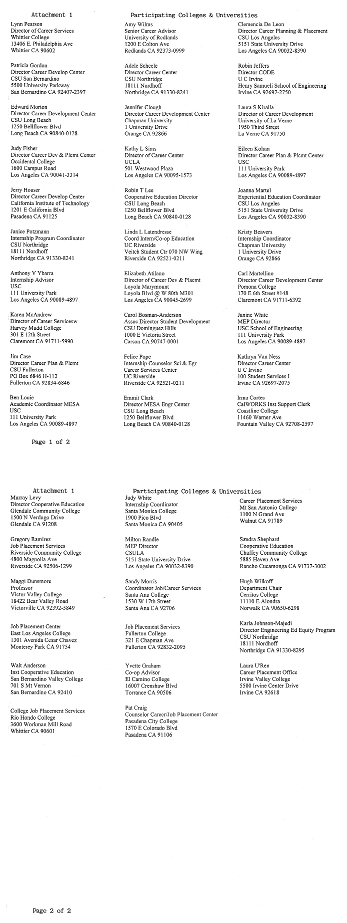 Barry R. Wallerstein, D.Env. Background Since October 1999, Public Affairs has been utilizing the services of student interns from the Co-op Program of the Cal Poly Pomona Foundation. This program has been beneficial for both AQMD and the student interns. College students who are selected for the program have gained real-world work experience at the same time that they are earning academic credits for their college education. These interns perform such tasks as assisting staff at outreach events, staffing the Public Information Center, and maintaining and tracking the inventory of AQMD outreach material. The total amount of the present contract through June 30, 2004 is $50,000. It is estimated that $28,000 of student intern services will be needed in 2004-05. Because an amendment of this contract will cause the cumulative contract funding to exceed $50,000, Board approval of a new contract is requested. Proposal Execute a new contract with Cal Poly Pomona Foundation for Co-op Program Services in an amount not to exceed $28,000 through December 31, 2005. Resource Impacts Funding for outside services for student interns in an amount not to exceed $28,000 is included in the FY 2004-05 Budget. Attachment (495 KB jpg image) Attachment 1 – Participating Colleges and Universities / / / |