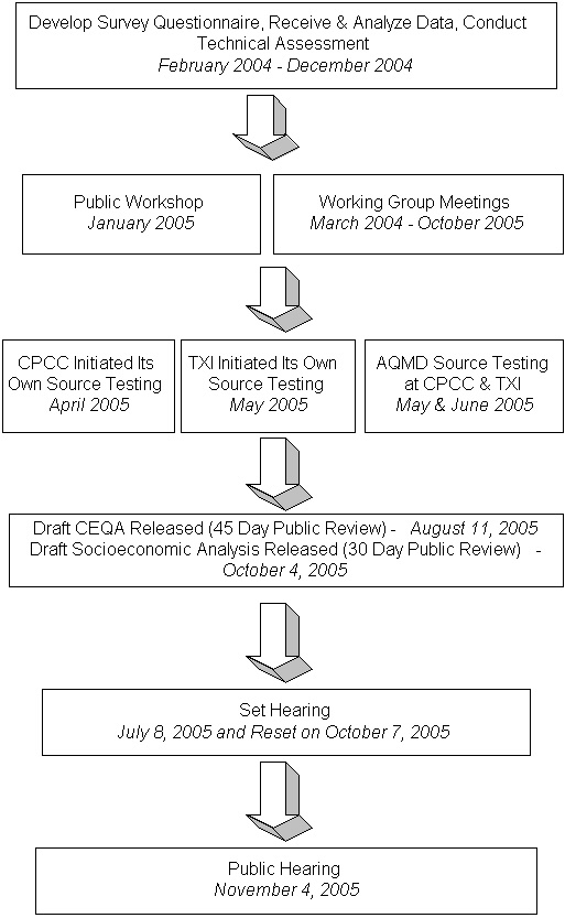 Barry R. Wallerstein, D.Env. Background Proposed Rule (PR) 1156 Further Reductions of Particulate Emissions from Cement Manufacturing Facilities has been developed to implement a portion of the 2003 Air Quality Management Plan (AQMP) Control Measure BCM-08 Further Emission Reductions from Aggregate and Cement Manufacturing Operations.1 Control Measure BCM-08 estimated a total inventory of 1.4 tons per day PM10 from all cement manufacturing, aggregate and aggregate processing facilities, and a reduction of 0.7 tons per day PM10 by 2010, in which the two cement manufacturing facilities located in the District would contribute approximately 25% of the emission inventory (or 0.35 tons per day PM10) and emission reductions (0.2 tons per day PM10). The two cement manufacturing facilities addressed under Control Measure BCM-08 and PR 1156 are California Portland Cement Company (CPCC) located in Colton, and Texas Industry (TXI), called Riverside Cement Company, located in Riverside. These two cement manufacturing facilities are significant sources of particulate emissions. California Portland Cement Company is ranked #11, and Riverside Cement Company is ranked #28 on the list of the top 50 particulate emitters in the Basin for 2000-2001.2 Control Measure BCM-08 and PR 1156 are developed to address particulate emissions generated from all process equipment at these two facilities such as crushers, screens, raw mills, finish product mills, kilns, clinker coolers, storage bins, hoppers etc. as well as fugitive emissions generated from open storage piles and vehicular traffic on paved and unpaved roadways. Air Quality Air Management Plan and Legal Mandates In 2002, the District requested the U.S. EPA to extend the Basin's attainment date for PM10 to 2006. The District's request for extension and its revised PM10 implementation strategy was approved by U.S. EPA in April 2003. Proposed Rule 1156 is developed to implement the 2003 Control Measure BCM-08, and when fully implemented, will generate emission reductions to help the region in fulfilling its obligations toward the PM10 State Implementation Plan (SIP), and in attaining the state and federal PM10 ambient air quality standards in 2006. Affected Facilities Two facilities in the Basin will be affected by the Proposed Rule 1156, California Portland Cement Co. (CPCC) and TXI-Riverside Cement (TXI). They are all identified by Standard Industrial Classification (SIC) 3241. CPCC manufactures grey cement and TXI manufactures both grey and white cement. Public Process Staff started the development of PR 1156 in February 2004. A Survey Questionnaire was developed in March 2004 to gather the most up-to-date information from the industry. Staff analyzed information received for emissions inventory and determination of emission reductions, conducted a technical assessment for feasibility and cost effectiveness, and held a Public Workshop in January 2005. In developing PR 1156, staff has conducted numerous working group meetings and worked closely with representatives of the impacted industry to resolve issues raised during the rule development process. As a result, PR 1156 was finalized and a Public Hearing was scheduled. Summary of Proposal PR 1156 establishes opacity performance standards for all operations, and future PM emission limits for process equipment vented to baghouses. Additional features of the proposed rule are to specify compliance options for open storage piles, primary crushing operations, conveying systems, and a method of verifying and assuring compliance with the rule requirements.