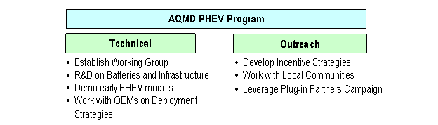 Barry R. Wallerstein, D.Env. Background The volume and success of gasoline-fueled hybrid electric vehicles (HEVs) are continuing to increase, with major automakers announcing new hybrid models each year. The manner in which the various vehicle components are sized, packaged, fueled, and controlled; however, substantially impacts the air quality benefits from these vehicles. One hybrid electric concept that offers substantial air quality benefits is the plug-in hybrid electric vehicle (PHEV), which can travel solely on battery power for a prescribed range thereby providing zero emission miles. AQMD has supported PHEV development since 2000 and has two current projects underway to demonstrate (1) DaimlerChrysler PHEV Sprinter delivery vans and (2) the conversion of Toyota Prius vehicles to PHEVs. There has also been national attention on PHEV technology as a means to reduce petroleum dependence, with diverse supporters including neo-conservative groups, environmentalists, and utilities. Austin Energy, the electric Utility for Austin, Texas, also recently initiated a national “Plug-in Partners” campaign to build a market for PHEVs by soliciting the top 50 US cities (by population) and their utilities to support PHEVs through incentives, fleet commitments, and educational outreach to communities. The Cities of Los Angeles and Irvine have already joined this effort (LA Times, January 25, 2006). As this technology continues to progress and realize lower and lower emissions, the AQMD Governing Board has directed staff to expand its efforts and leverage existing programs elsewhere to accelerate PHEV commercialization. Proposal Staff proposes two parallel efforts, one technical and one outreach-oriented, to expand the AQMD’s existing PHEV program. PHEV Technical Plan There are critical areas of technology progress, particularly in battery development, that need to be addressed if PHEVs are to become commercially viable. Many of the issues that challenged mass electric vehicle deployments are still open questions with the new battery technologies, e.g., durability, battery life with depth of discharge, replacement cost, and safety. Selecting the optimum chemistry and battery type (power vs. energy) are also important factors to incorporate in the vehicle design. For example, a transit bus will have different requirements than a light-duty passenger vehicle. Although AQMD partners are working on these issues, increased pressure, attention, and funding may accelerate this progress. Staff recommends convening a working group of key partners, such as DaimlerChrysler, EPRI, and SCE, along with technical advisors and other invited experts, to develop a strategic research, development, demonstration, and deployment PHEV Technical Plan (PHEV Tech-Plan) to address and overcome these barriers. All of the major automobile manufacturers, especially the ones with commercial hybrid vehicles (Ford, Honda, and Toyota), will also be invited to participate. The working group will assist staff in developing projects to include in the PHEV Tech-Plan but the individual projects will still require Governing Board approval for implementation. The PHEV Tech-Plan will be technology-driven to accelerate the implementation of commercially-ready PHEVs. The second part of the strategy is to address the demand-side of the equation by educating and incentivizing early adopters through outreach activities. PHEV Outreach Plan Staff proposes that Public Affairs and the Technology Advancement Office establish a PHEV Outreach Plan which identifies key stakeholders to educate regarding PHEV technologies. These stakeholders should include, but are not limited to, local city governments, public and private fleets, environmental groups, community groups, and municipal utilities. The Outreach Plan will educate these entities on the benefits of PHEVs and suggest strategies to incorporate vehicles into their fleets. As part of the Outreach Plan, these stakeholder groups will have the opportunity to test-drive the early, pre-commercial demonstration vehicles being sponsored by the AQMD. These ride-and-drive visits will also provide the opportunity for AQMD to discuss other issues of importance; for example, staff can discuss the Clean Air Choices list, which identifies the cleanest vehicles available today for commercial purchase. The Outreach Plan will also work with the stakeholders to identify funding mechanisms to assist in incentivizing early adopters to purchase PHEVs. Utilities will be encouraged to adopt lower rates or rebates for customers purchasing PHEVs. Discussions will be initiated to identify state and local incentive funding sources to help buydown the incremental cost of the new technology. Finally, staff proposes that the AQMD Outreach Plan collaborate with the Austin Energy “Plug-in Partners National Campaign,” initiated by the electric utility in Austin, Texas. This is a national effort to secure “soft-orders” for PHEVs and targets the 50 largest cities (by population) and their utilities. There are educational and outreach components being developed by Austin Energy that would leverage the AQMD PHEV Outreach Plan, and the AQMD Program could assist the Plug-in Partners Campaign by showcasing the early demonstration PHEVs. Fleets within the AQMD could also be encouraged to participate in the “soft-orders” to leverage with other fleets nationwide and signal the automobile manufacturers that a market does indeed exist. A diagram of the proposed components of the expanded PHEV program is provided in Figure 1.