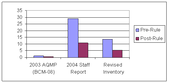 Revised PM10 Emissions Inventories and Assumptions A. Pre-Rule As stated earlier, baseline (pre-rule) PM10 emissions for the aggregate and related operations were estimated to be 29 tons per day (Rule 1157 Staff Report, December 3, 2004). It should be noted that industry representatives provided valuable additional information that assisted in refining certain key assumptions. The revised PM10 baseline emissions inventory is now estimated to be 13.7 tons per day, which represents a 53% decline from the adopted Rule 1157 emissions inventory. The increase in the current level of pre-rule control from 20% to 50% and other revised assumptions resulted in lower PM10 baseline emissions for process equipment, open piles/storage, and unpaved roads. However, baseline emissions from paved roads increased because it was agreed that emissions from these roads have been essentially uncontrolled up to the time that the rule was adopted. B. Post-Rule For PM10 emission reduction calculations (post-rule), staff has agreed to assign a 95% control efficiency to water application based on the assumption that the industry will strictly adhere to the PM10 control requirements of Rule 1157. Using the revised PM10 baseline emissions, staff recalculated the PM10emission reductions for each PM10 emission source. The revised total PM10 emission reduction is now 5.7 tons per day based on the revised baseline versus 18 tons per day reduction as reported in the Staff Report for Rule 1157. The remaining inventory with full implementation of Rule 1157 is now 5.3 tons per day (versus 11 tons per day as reported in the Staff Report for Rule 1157). The final revised pre-and post-Rule 1157 emissions inventories were sent to CMA representatives on October 6, 2006. A letter of response from CMA dated October 17, 2006 indicated that CMA has agreed to the revised pre-and post-rule emissions inventories presented by staff, notwithstanding the remaining areas of disagreement. CMA recognized the significant progress in refining the emissions inventory and the development of a better working relationship as both parties continue to work on other areas of the settlement agreement. It should be noted that CMA’s calculations put the pre- and post-rule emissions for the industry at less than half that of staff’s calculations. Figure A provides a summary of the emissions from this industry assumed in the 2003 AQMP, the baseline and post-rule implementation remaining emissions included in the December 2004 Staff Report, and the revised baseline and remaining emissions, which will be incorporated into the 2007 AQMP. Figure A: Rule 1157 Revised Inventory Comparison Tons Per Day Appendix A shows a comparison of the revised PM10 baseline emissions and remaining PM10emissions by category with those presented in the December 2004 Staff Report. Attachment(s)