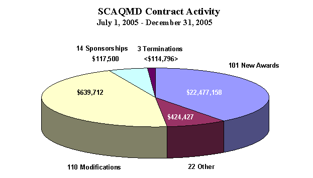 Barry R. Wallerstein, D.Env. Background Since FY 1995-96, staff has provided semi-annual reports to the Board on District contract activity. This report identifies five categories of contract awards: 1) New Awards new contracts for professional services and research projects; 2) Other air monitoring station leases, Board Assistant agreements, revenue contracts from other agencies, or miscellaneous lease agreements that generate revenue, e.g., lease of AQMD space; 3) Sponsorships contracts funding public events and technical conferences which provide air quality benefits; 4) Amendments modifications to existing contracts usually reflecting changes in the project scope and/or schedule; 5) Terminated Contracts Partial Work Performed modifications to contracts to reflect termination of a portion of work which result in de-obligation of contract funding. The report further specifies under New Awards, which contracts were awarded competitively and which were awarded on a sole-source basis. Within each of the first four categories, the level of approval (Board or Executive Officer) is indicated. Summary Of the 250 contracts and contract modifications issued during this period, New Awards accounted for 101, Other accounted for 22, Sponsorships accounted for 14, and Contract Modifications accounted for 110. The total value for New Awards was $22,477,158. Of this amount $20,189,958, or 90%, was awarded through the competitive process. The total value of all contracts and amendments for this period was $26,658,797, with 128 contracts and contract modifications totaling $25,482,208 approved by the Board and 120 contracts and contract modifications totaling $1,176,589 approved by the Executive Officer (which does not include de-obligation of funds for terminated contracts as listed on page 18 of the attached report). Of this latter amount, $422,677, representing 14 contracts, was for Board Member Assistant contracts as approved by the Boards Administrative Committee; $415,462, representing 72 contracts, was for contract modifications for extensions of time or additional budgeted services from previously approved vendors, and $169,864 was for new outside legal services. Three contract terminations during this period de-obligated a total of $114,796. Attachments (XLS