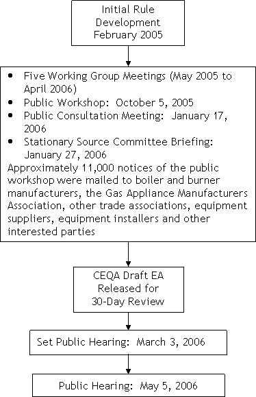 The rule development effort for PAR 1146.2 is part of an ongoing process to assess low NOx technologies for boilers and heaters. For this rule development, staff held five working group meetings since March 1, 2005, a public workshop on October 5, 2005 and a public consultation meeting on January 17, 2006. These meetings were attended by representatives from manufacturers, trade organizations and other interested parties. At these meetings low NOx technology, Rule 1146.2 certification test results and proposed emission limits were discussed. Staff also held individual meetings with manufacturers of boilers, water heaters, burners and burner materials.