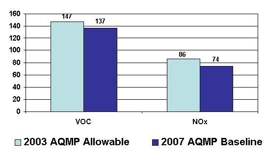 * The 2003 AQMP had a total of 5.1 tons per day NOx commitment. However, 2.1 tons per day from an SCAQMD truck stop electrification measure were accomplished as part of CARBs truck idling regulation. The SCAQMD commitment of 3.0 tons per day NOx reflects this adjustment. Even though the total VOC reductions are less than the commitment for the year 2006, the figure below, from the draft 2007 AQMP, shows that sources under SCAQMD jurisdiction are below the 2003 AQMP allowable emissions for the year 2010 for both VOC and NOx. The reductions exceeding the expectation are primarily because many facilities operate below compliance limits in rules and benefits of new source review are not adequately accounted for in the previous estimates.