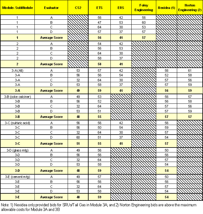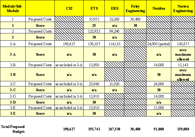 Detailed technical scores for all contractors, scores for proposal costs,