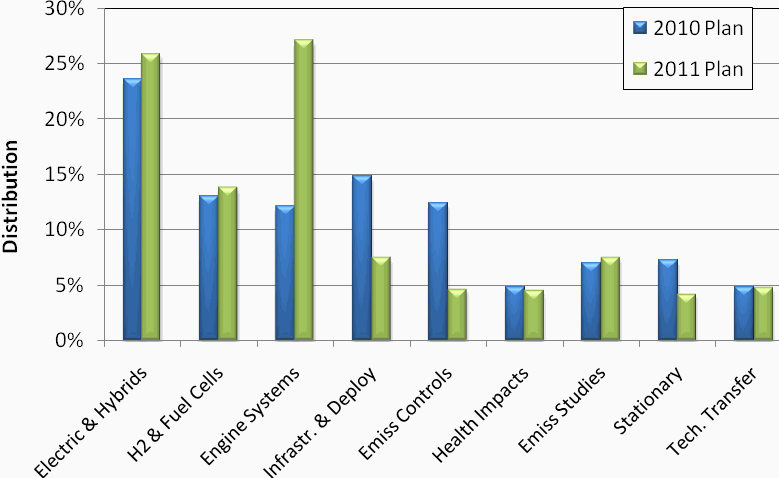 Barry R. Wallerstein, D.Env. Background In March 2007, the Board requested that staff bring the Clean Fuels Program Plan Update before the Board as a separate item to solicit more direct input on the distribution of potential project funds before requesting final approval each year in early spring. Staff has prepared a calendar year 2011 Clean Fuels Program Draft Plan Update with major emphasis on electric and plug-in hybrids, including their infrastructure, clean engine technologies and systems, support for hydrogen and fuel cell technologies and refueling infrastructure deployments, including upgrades and expansions to refurbish or increase capacity for alternative fuel stations installed five or more years ago. Proposal The attached Clean Fuels Program Draft Plan Update identifies potential projects to be considered for funding during 2011. The proposed projects reflect promising low- and near zero- or zero-emission technologies and applications that are emerging in the different source categories. This update includes a number of proposed projects, not all of which are expected to be funded in the current fiscal year given the available budget. Projects not funded in 2011 may be considered for funding in subsequent years. In addition to identifying proposed projects to be considered for funding, this Update confirms ten key technical areas of highest priority to the AQMD. These high priority areas are listed below based on the proposed funding distribution shown in Figure 1: